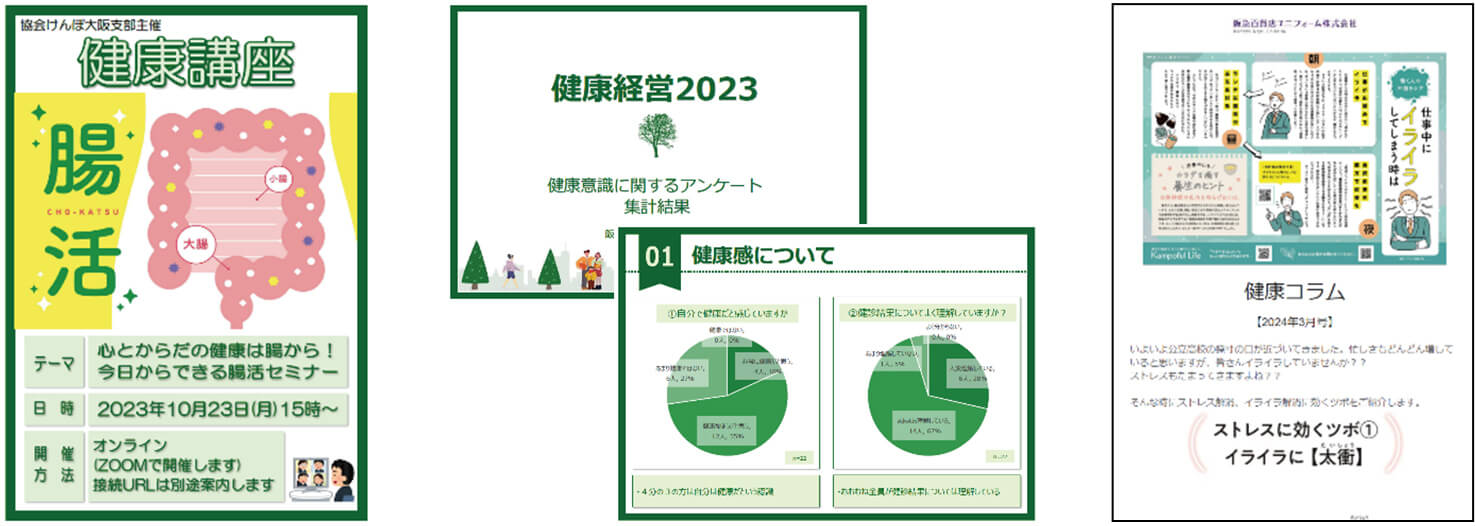 社内での健康講座の開催や、健康意識に関するアンケート調査を行うなど、従業員一人ひとりが日常的に健康に対する意識を高め、心身ともに健康でいきいきと働くことができるよう、従業員に対する啓発活動や情報提供を積極的に行っております。