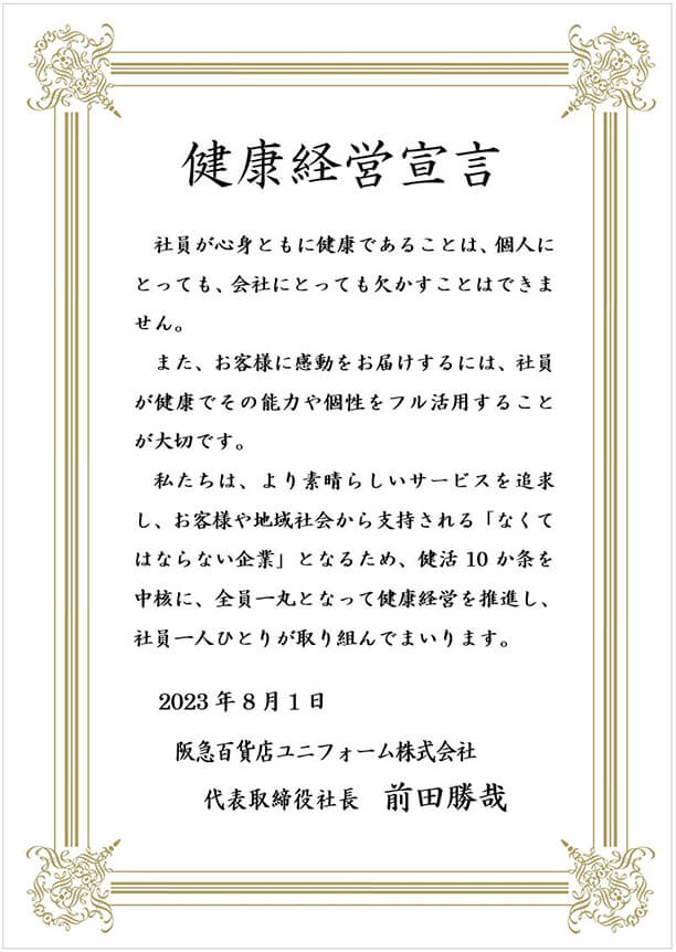 当社では、「人の尊重」を大切な価値観としており、従業員やその家族の健康が会社の豊かな未来の礎であると考え、「健康経営宣言」を制定しています。